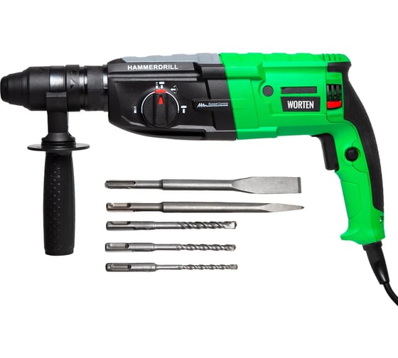 Перфоратор SDS-plus сетевой в кейсе с набором 5 буров и зажимным патроном 850Вт WORTEN это надежный ударный инструмент, идеально подходящий как для профессиональных, так и для домашних задач. Перфоратор спроектирован для длительной эксплуатации, он обеспечит высокую производительность и комфорт при работе с различными материалами. Он функционирует в трех режимах: сверление, ударное сверление, долбление. Режим сверления поможет сделать отверстия на податливом материале, например, в древесине. Режим ударного сверления подходит для бурения отверстий в бетоне и кирпичной кладке, а режим долбления – для проведения отбойных работ, штробления, а также при разрушении конструкции. Легкий доступ к щеткам: упростит техническое обслуживание и продлит срок службы инструмента.