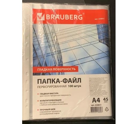 Перфорированные папки-файлы BRAUBERG А4, комплект 100 шт, гладкие, 45 мкм 226831 предназначены для хранения документов в папке с любым кольцевым механизмом или скоросшивателем.