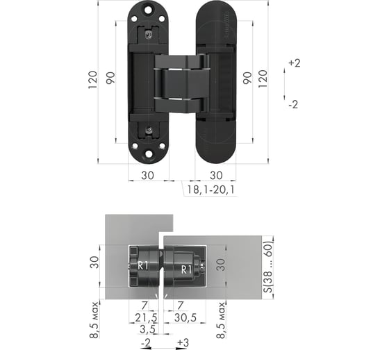 Петли скрытой установки U3D3300 предназначены для установки в межкомнатные двери толщиной от 38 мм и рассчитаны на нагрузку до 60 кг при установке двух петель.