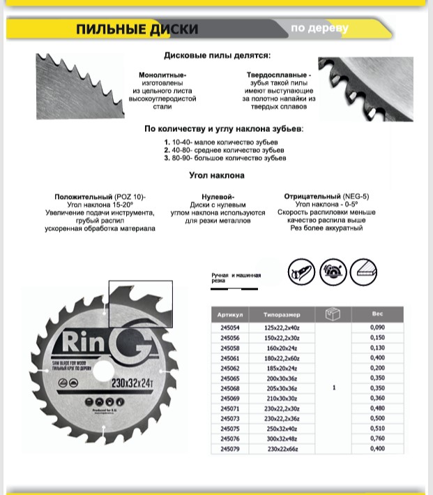 RinG ПИЛА ДИСКОВАЯ ПО ДЕРЕВУ - это твердосплавный пильный диск созданный для распиловки древесины . Пильные полотна изготавливаются из высококачественной стали, а зубья с твердосплавными напайками. Благодаря идеально заточенным зубьям и 100% ровному пильному полотну обеспечен безупречно ровный и точный распил. Фото может отличаться от оригинала..