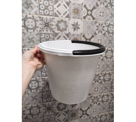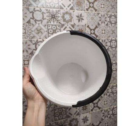 Ведро имеет мерную шкалу, ручку для переноса, удобный носик для слива и выемку на дне для руки.