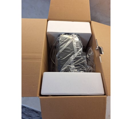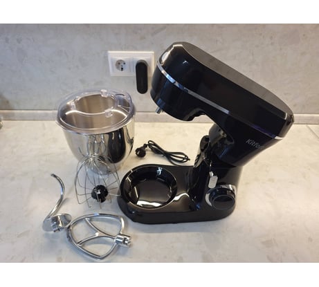 Надежно упакован. В комлекте все насадки имеются. Отличная вместительная и выполненная из металла чаша на 4.5л. Крючки для густого теста из металла. На чаше было бы здорово видеть отметки объёма. Шум при работе в пределах разу ного.
