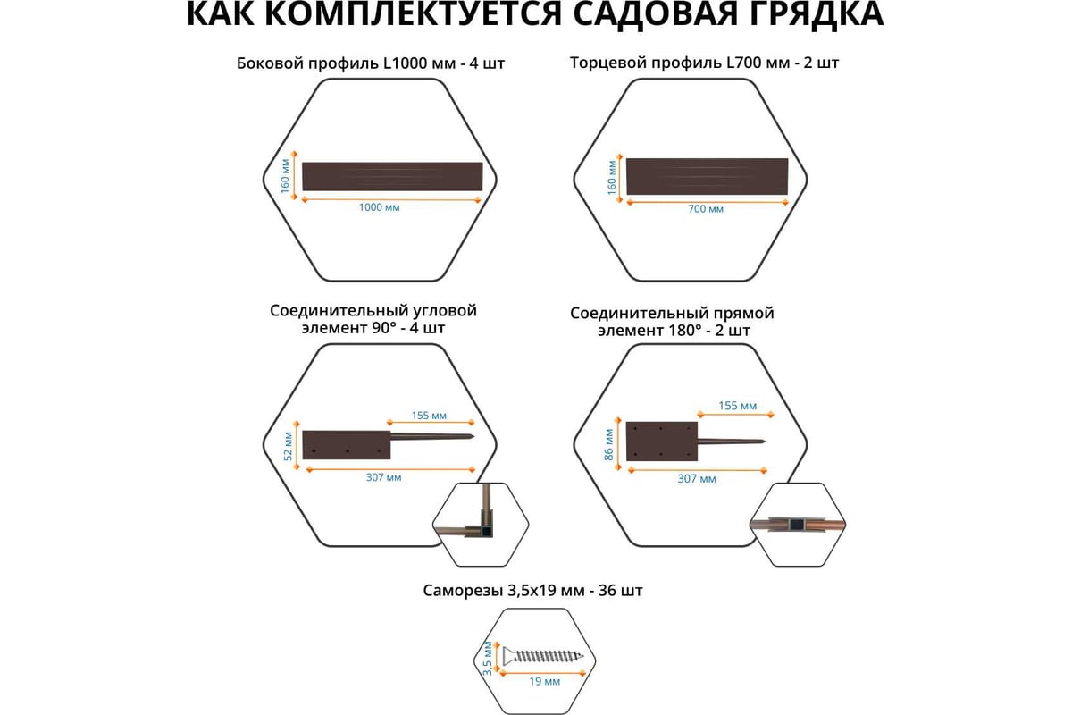 В комплект входят два профиля длиной 0,7 м и четыре профиля длиной 1 м, что позволяет легко формировать грядку нужной формы и размера. Для надежного соединения профилей предусмотрены боковые соединения (4 шт.) и прямые соединения (2 шт.), что обеспечивает дополнительную прочность конструкции.