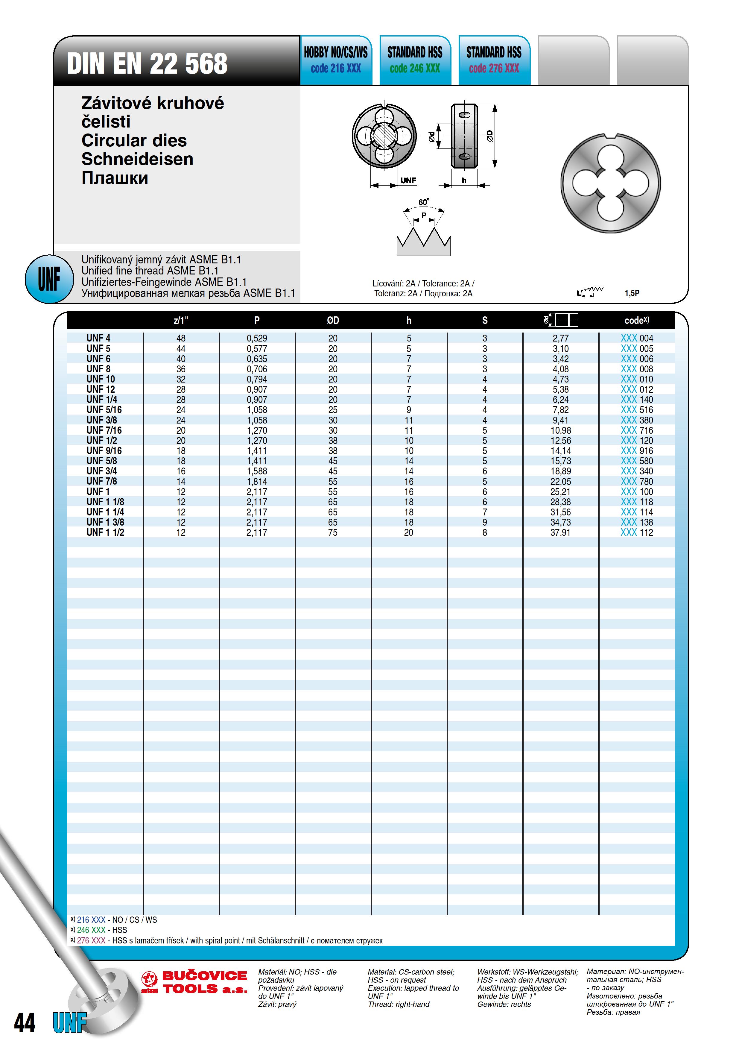 Плашка Bucovice Tools UNF №12 -28 HSS 20x7мм 246012BT, предназначена для нарезания внешней унифицированной дюймовой резьбы американского стандарта UNF в различных материалах. Изготовлена из высококачественной быстрорежущей стали HSS, которая гарантирует прочность и износостойкость.