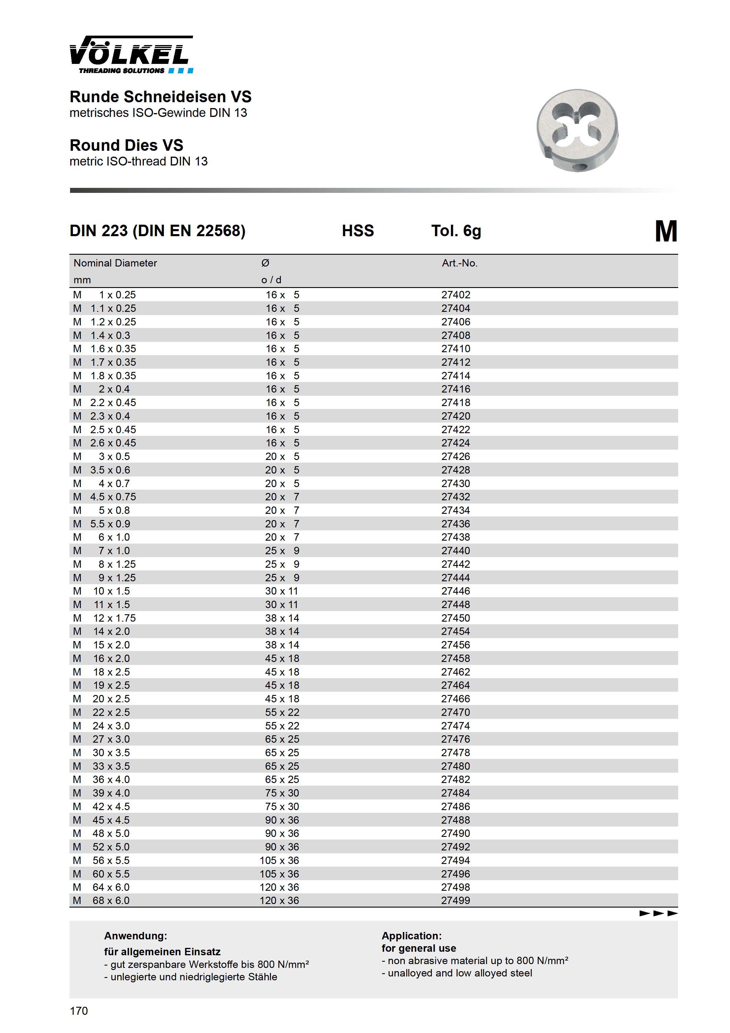 Плашка Volkel предназначена для создания метрической резьбы, с углом профиля 60 градусов. Изготовлена из высококачественной быстрорежущей стали HSS, которая гарантирует прочность и износостойкость. Подходит для обработки заготовок, выполненных из нелегированной и низколегированной стали, алюминия, меди, бронзы, цинка, с пределом прочности до 800MPa.