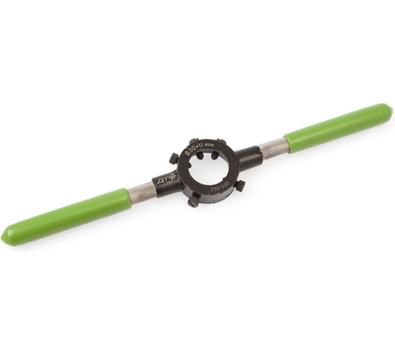Плашкодержатель предназначен для фиксации плашек при нарезании внешней резьбы. Имеет форму круглой обоймы, внутренний диаметр которой немного больше внешнего диаметра плашки. Резьбовые отверстия для стопорных винтов обеспечивают надёжную фиксацию плашки. Корпус из стали гарантирует высокий ресурс работы. Накатка по всей длине рукояток и дополнительная ПВХ обливка обеспечивают надёжность хвата, а разборная конструкция – удобство хранения. Материал - сталь А3.