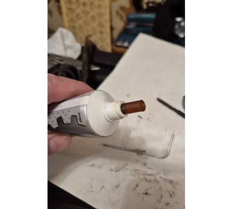 Темно-коричневая плотная масса, выдавливающаяся из тюбика стержнем который стоит как карандаш. Такой вид имеет литол наверное 30 летней давности. Хотел в редуктор но остерегусь.