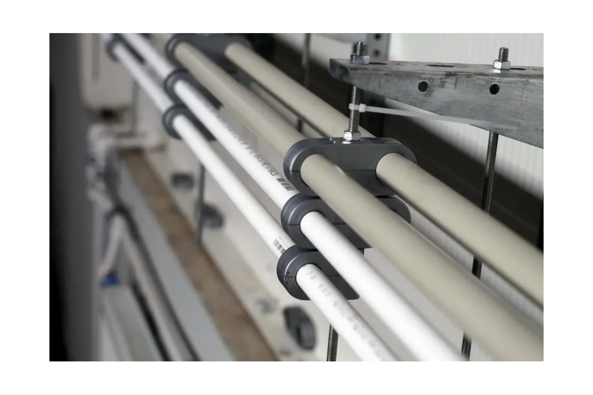- Возможность крепления пары труб одним креплением и фиксации к стене (двойной хомут)