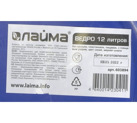 Пластиковое пищевое ведро ЛАЙМА 12 л, без крышки с узором, цвет синий, мерная шкала 603894