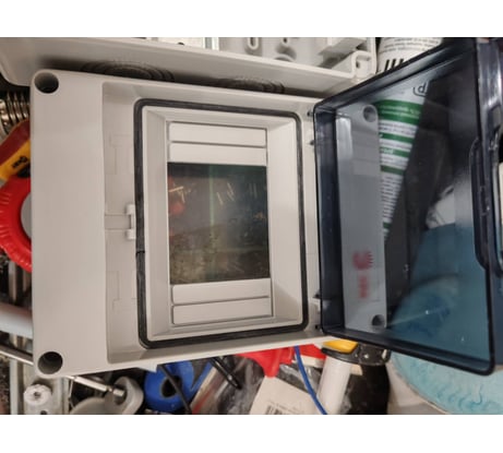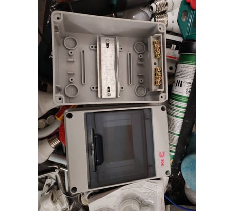 В комплекте: - DIN-рейка; - две шинки х4, на пластиковой вставке, есть место для установки шины на дне корпуса; - два сальника для ввода трубы/кабеля (разного размера, цвет сальников - почти белый - отличается от цвета корпуса)