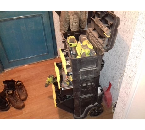 Отличный органайзер на колёсах. Каждой вещи найдётся своё место. Разложил в него самый необходимый инструмент и приспособы. По лестнице аккуратненько можно тащить вверх и вниз не разбирая. Смотрится солидно