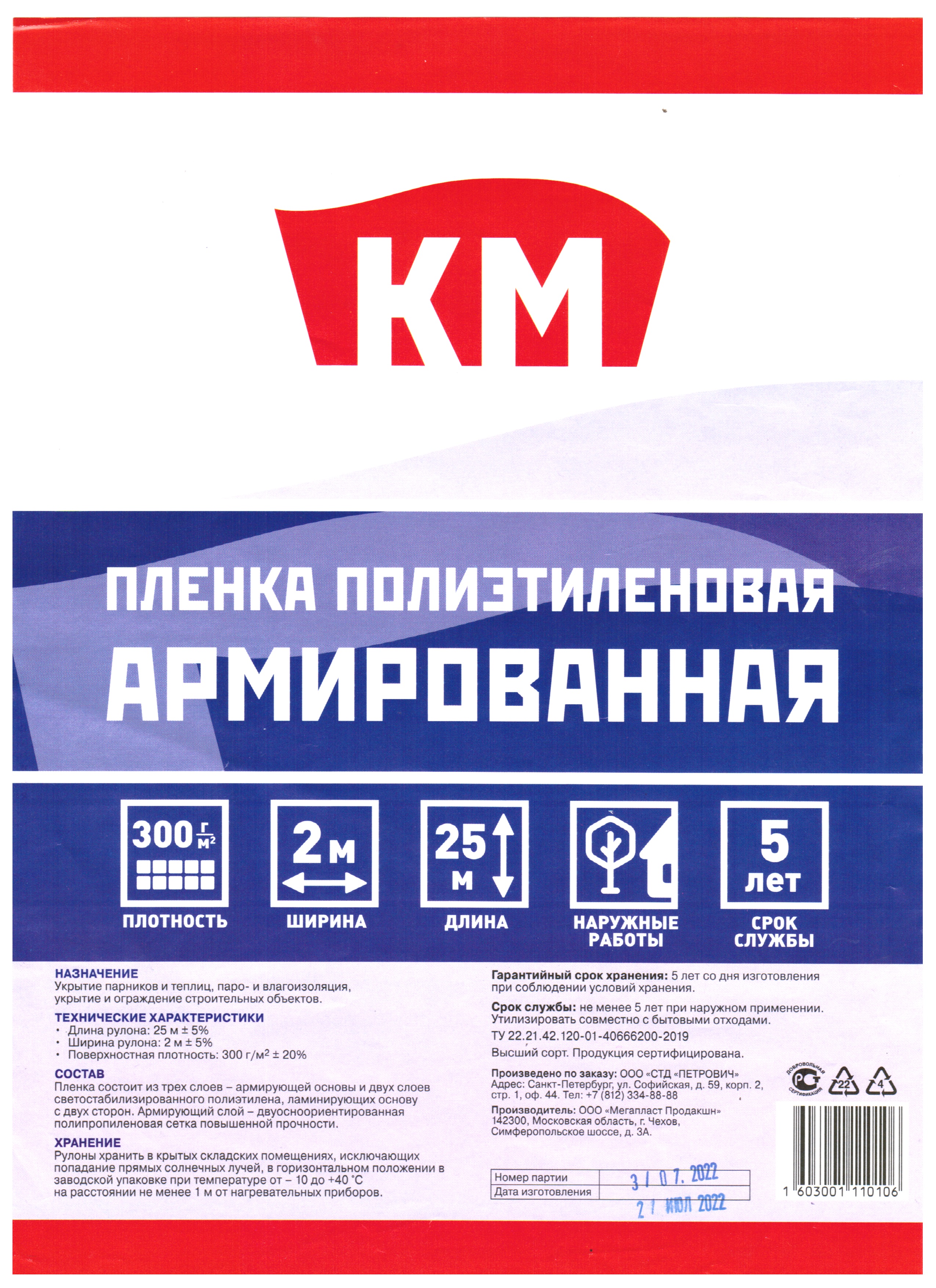 Пленка армированная – это трехслойный материал, состоящий из двух внешних слоев светостабилизированной пленки, изготовленной из полиэтилена высокого давления, между которыми находится слой армирующей сетки. Произведено по ТУ 22.21.42.120-01-4066200-2019