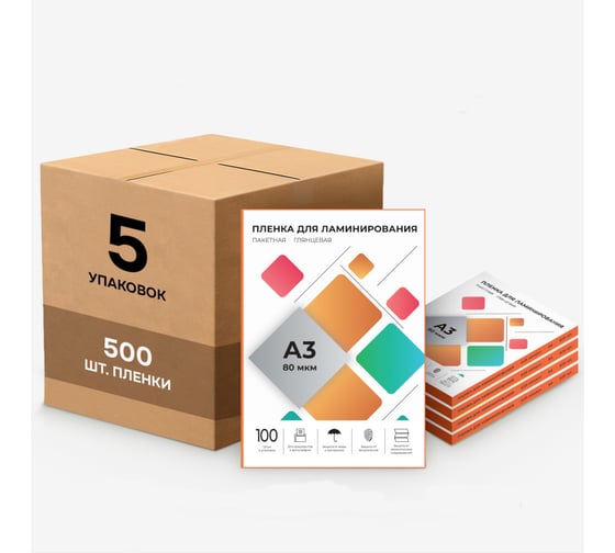 Набор: пакетная глянцевая пленка для горячего ламинирования - формат А3 плотностью 80 мкм 5 упаковок по 100 шт. В каждой упаковке 100 штук листов для ламинирования. Подходит для ламинатора любой марки. Заламинированный материал защищен от механических воздействий (нежелательных надписей, потертостей), от влаги и выгорания. Пленка придает бумаге презентабельный внешний вид, делает ее более жесткой. Чем больше мкм в пленке - тем жестче готовый материал.