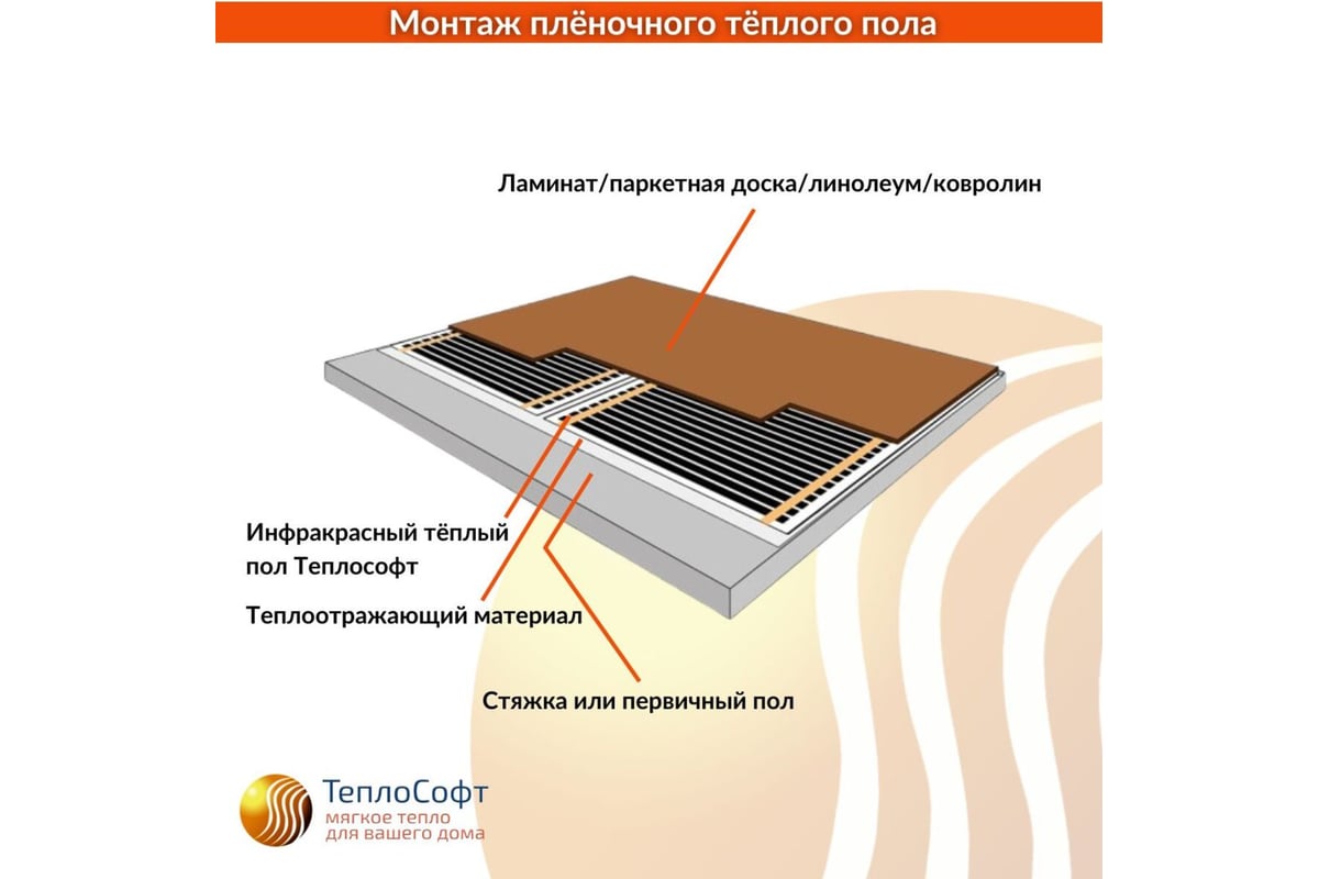 Плёночный электрический тёплый пол ТеплоСофт 3,5м.кв. с электронным терморегулятором плёнка 3,5м.кв./эл представляет собой тонкую термопленку, нагревательными элементами которой являются карбоновые полосы, изолированные специальным слоем, который обеспечивает защиту от внешних физических воздействий.