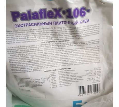 Плиточный клей PALADIUM PalafleX-106 Экстрасильный класс C2T, 5 кг PL5-106 предназначен для облицовки стен и полов крупноформатными тяжелыми плитами и плит среднего формата и веса из натурального и искусственного камня, керамогранита размером 60х60 см, любыми видами керамической, клинкерной плиткой в зданиях различного значения. Наносится на прочные недеформирующиеся основания: бетонное (монолитное, панельное), кирпичное, газо-, пенобетонное, оштукатуренное (гипсовое, цементное, известково-цементное), ПГП, гипсовый пол и прочно зафиксированные ГКЛ и ГВЛ.