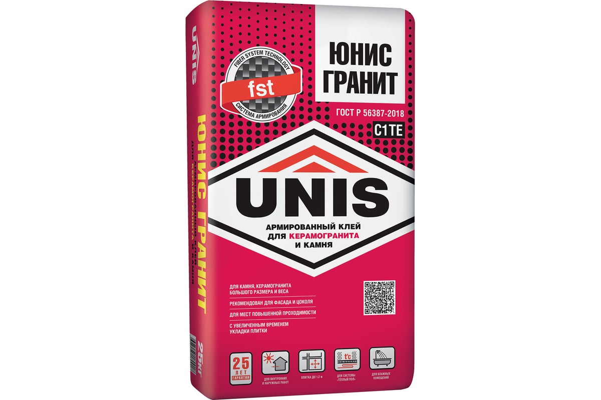 Плиточный клей UNIS Юнис-Гранит 25 кг, класс C1TE 24670 4607005180018 применяется для наружной и внутренней облицовки оснований, подверженных повышенным эксплуатационным нагрузкам: цоколи, колонны, наружные лестницы, подвалы, печи и камины. Продукт используют для облицовки внутри помещений с нормальной и повышенной влажностью: ванные комнаты, балконы и террасы.