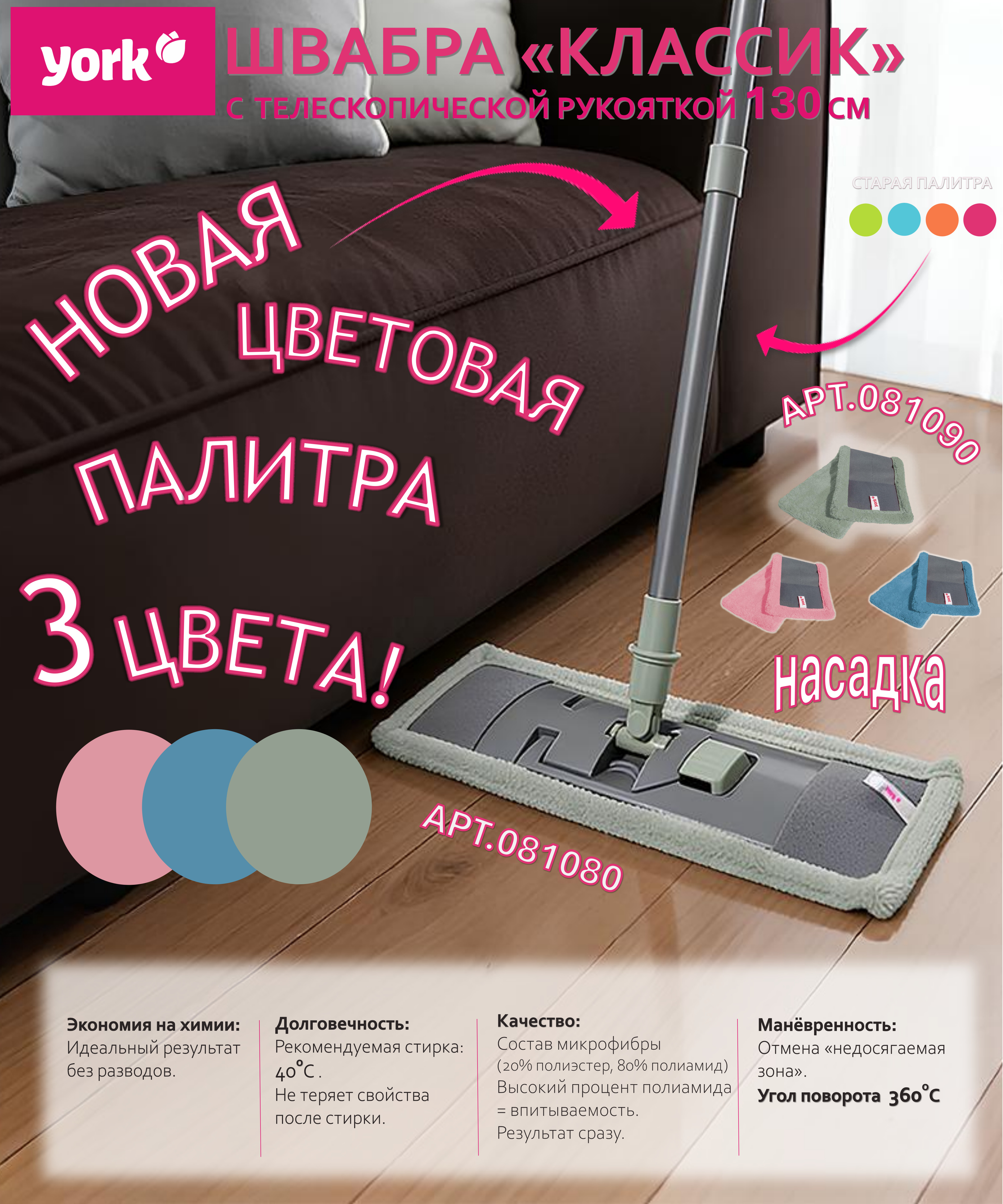 Плоская насадка YORK МОП Classic для швабры/держателя 40 см, карманы микрофибра 081090
