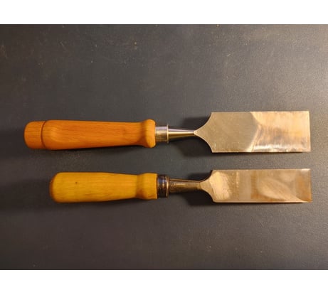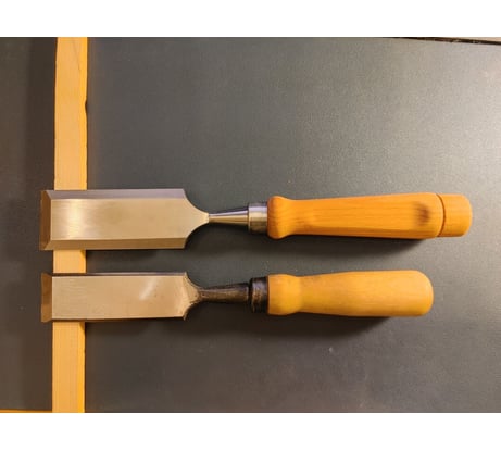 Попробую сравнить со стамеской Арефино горячей штамповки (на фото сверху - Кобальт 40мм, снизу - Арефино 32мм). Стоимость стамесок примерно одинаковая, у Арефино в линейке нет стамесок шире 32мм. Обе стамески используются как столярные. - Качество стали мне больше нравится у Арефинской стамески, у нее металл более пластичный. У Арефино кромка скорее мнется, у Кобальта - скалывается. - Геометрия лучше у Кобальта. На обеих стамесках острые боковые кромки, у Кобальта еще и в районе шейки. Лучше эти кромки затупить, чтобы не поранить кожу на руках. - В случае с Кобальтом я потратил гораздо меньше усилий на то, чтобы вывести лицевую сторону и заточить стамеску. У Арефинской стамески я не стал дошлифовывать впадину на лице, что видно на фото. Для заточки новой Арефинской стамески лучше использовать электроточило, вручную - замучаешься. Кобальт вполне можно заточить вручную. - Ручка у Арефино из березы, у Кобальта из бука. По удобству ручки мне больше нравится Кобальт, но это весьма субъективно. Кольцо на ручке Кобальта - скорее декоративное, я его снял слегка поддев плоской отверткой. Если работать с сильным ударом, лучше на край рукояти надеть небольшой отрезок стальной водопроводной трубы с внутренним диаметром 25мм.