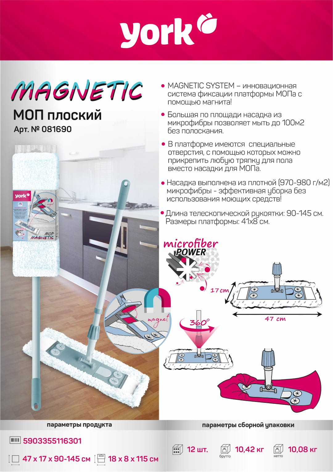 Швабра с плоским моп YORK МАГНЕТИК 081690 предназначена для уборки помещений.