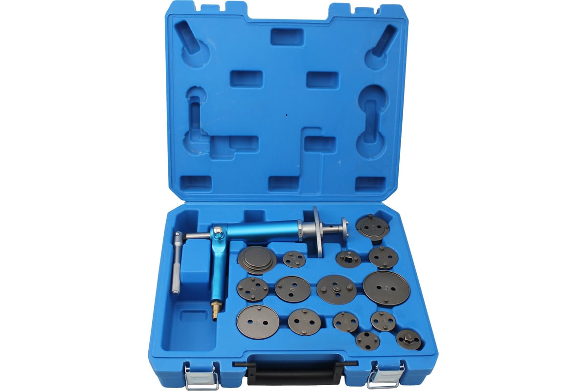 Пневматический инструмент сведения тормозных цилиндров AE&T /16 предметов/ TA-B1075 предназначен для обслуживания тормозной системы транспортных средств в автосервисах и ремонтных мастерских. Устройство подходит для суппортов с левой и с правой резьбой.