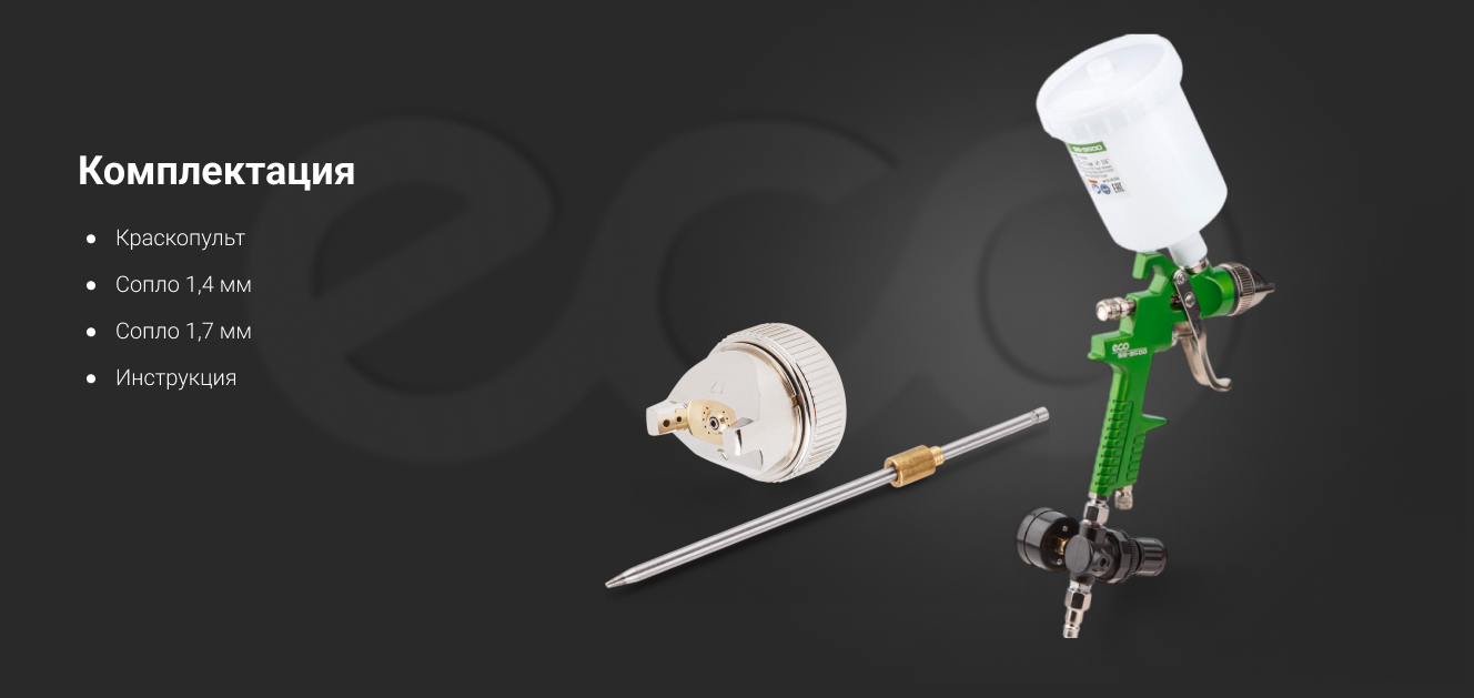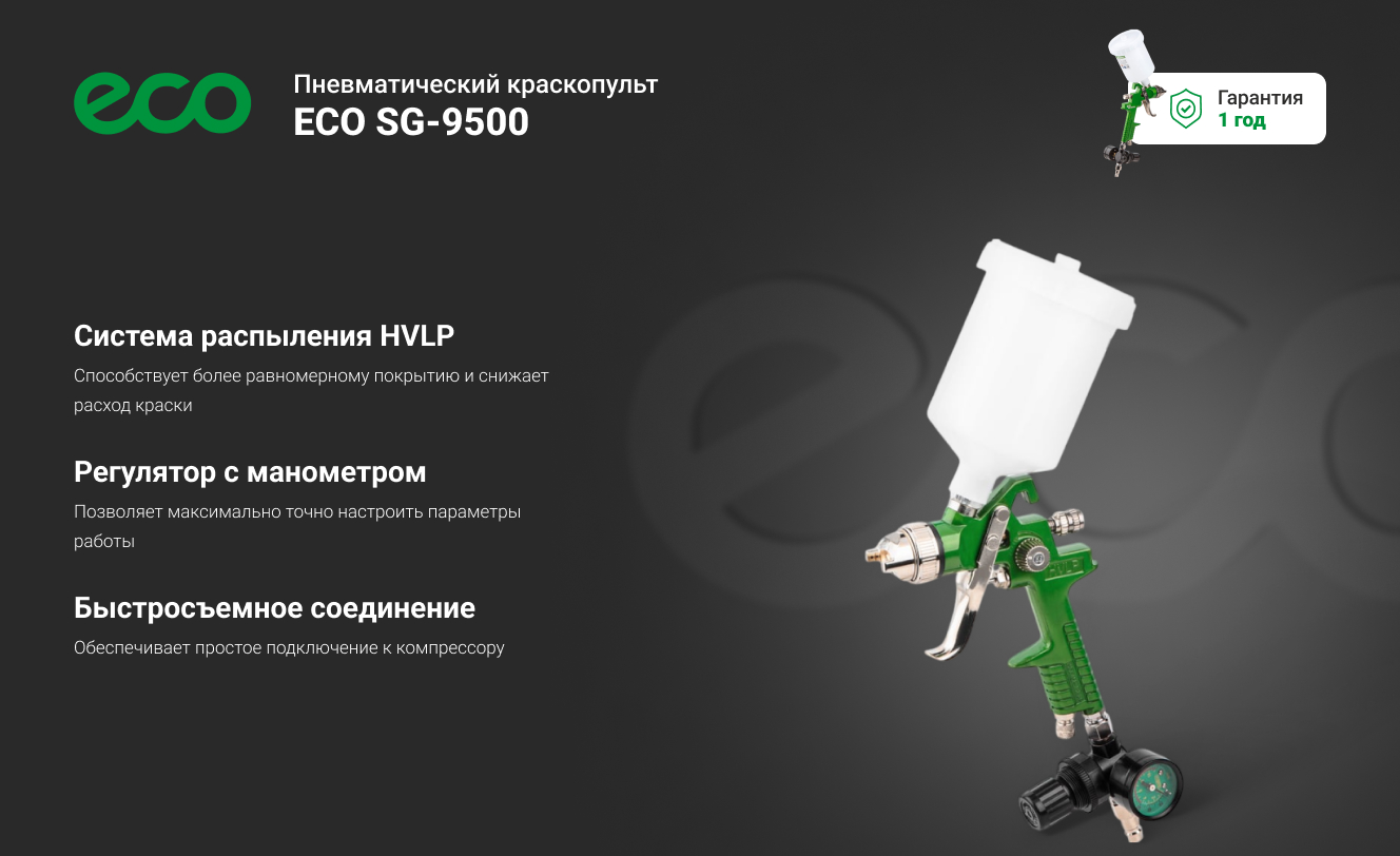 Приветствую! Пользуюсь краскопультами ECO : SG-1500,SG-3000L,SG-9500. Выбираю модель SG-9500 для покраски грунт-эмалью изделий из листового металла и металлокаркасов-справляется отлично со всем объемом. Рекомендую к покупке!