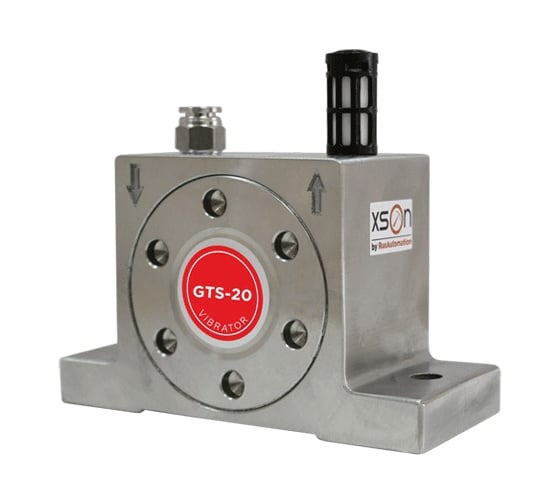 Пневматический вибратор турбинный XSON из нержавеющей стали, рабочее давление: 2...6 бар, частота: 16 950...23 100 Гц, сила вибрации: 2 180...5 500 H, потреб. воздуха: 188...465 л/мин, раб. темп: -20…+150 С, присоединение: G 1/4 -GTS-20 XSON-GTS-20