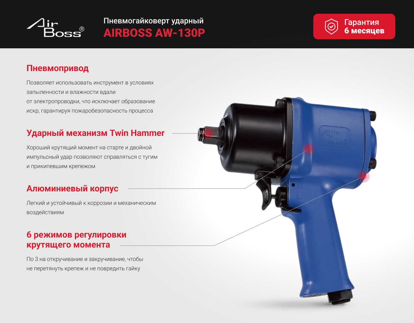 Пневмогайковерт AIRBOSS AW-130P находит применение при слесарно-монтажных работах. Большой крутящий момент и ударный механизм обеспечивают высокую производительность.