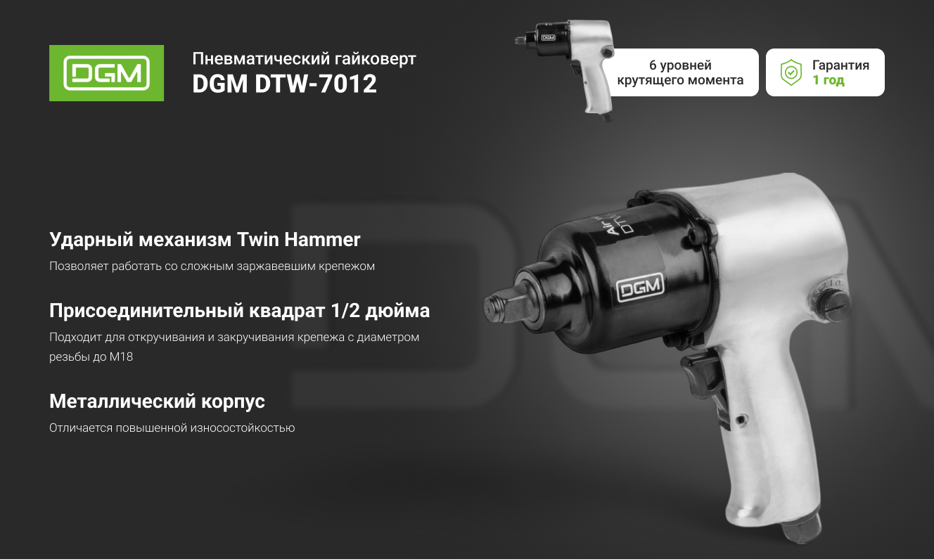 Пневмогайковерт DGM DTW-7012 предназначен для выполнения монтажных и ремонтных работ. Имеет6 уровней крутящего момента.