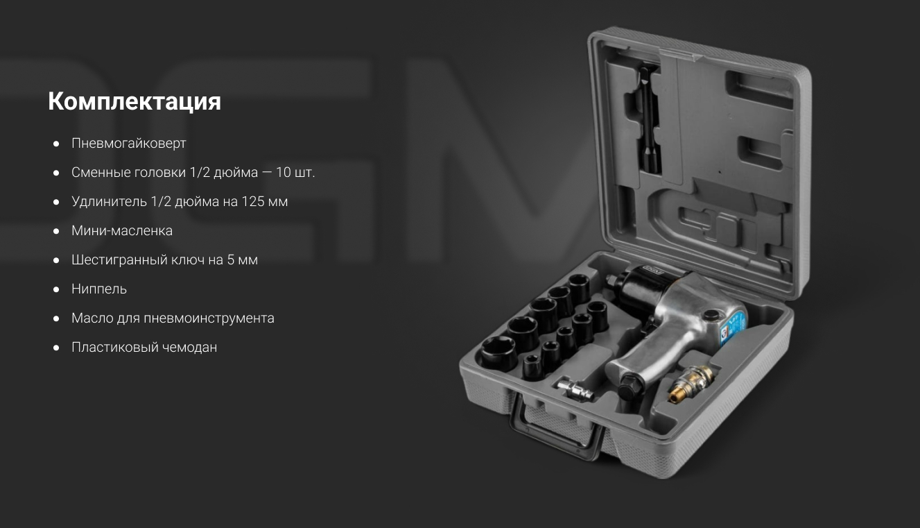 Приобрели этот пневмогайковерт для автосервиса, где регулярно требуется быстрый и мощный инструмент для откручивания затянутых гаек на колесах, а также для сборки/разборки тяжелых узлов. Нужен был надежный аппарат, способный работать под нагрузкой без потери мощности и перегрева. Как используем: Откручивание и затяжка колесных болтов на легковых и коммерческих авто Работа с подвеской, тормозными системами и ходовой частью Сборка металлоконструкций в ремонтной зоне Демонтаж прикипевших гаек и шпилек Особенности товара: Рабочее давление 6,2-8,3 бар обеспечивает стабильную работу. Скорость холостого хода до 8000 об/мин позволяет быстро откручивать гайки. Вес 3,8 кг оптимален для комфортного использования. Прочный корпус из износостойкого сплава. В комплекте шестигранник для быстрой замены насадок. Советы другим пользователям: Обязательно используйте масло для пневмоинструмента – это продлит срок службы ударного механизма. Следите за чистотой воздушного фильтра компрессора – загрязнения снижают эффективность. Перед работой с ответственными соединениями проверяйте момент затяжки динамометрическим ключом. Храните инструмент в сухом месте, предварительно смазав воздушный вход. Итог: DGM DTW-7012 – отличный профессиональный инструмент для автосервиса и строительных работ. За полгода ежедневного использования ни разу не подвел, легко справляется с самыми сложными задачами. Рекомендую мастерам, которым нужен мощный, долговечный и удобный пневмогайковерт. Соотношение цены и качества на высоком уровне!