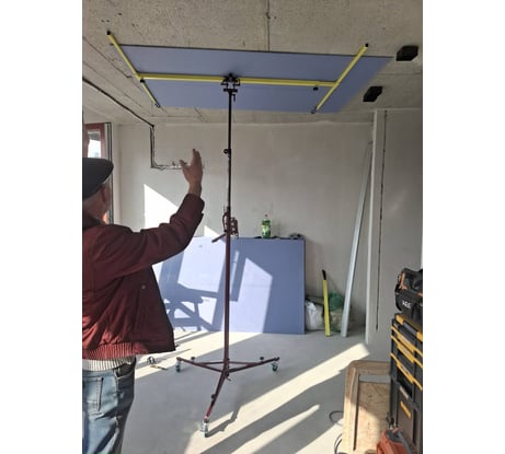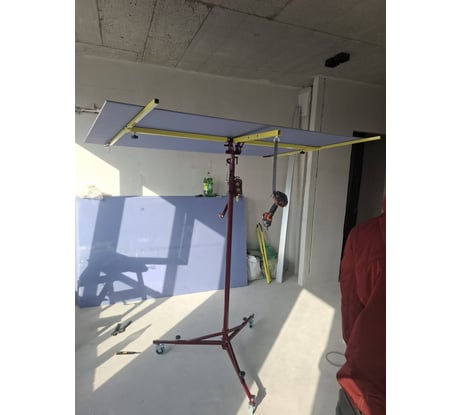 Для универсала-одиночки незаменимая штука. Даже подсобник или напарник не способны полноценно её заменить при монтаже ГК. Когда двумя головами и тремя руками придерживаешь лист, оставшейся свободной рукой орудуешь шуруповёртом. Уложил лист на площадку. Неторопливо разметил и просверлил отверстия под выводы коммуникаций, если необходимо. Спокойно неторопливо непосредственно на листе зафиксировал закладные под навесное оборудование, если необходимо. Подкатил всё сооружение на место, приподнял. Протянул провода в отверстия, если необходимо. Прижал лист к каркасу. Тщательно выровнял, выдерживая необходимые зазоры. И неторопливо начинаешь крепить, как положено, продвигаясь от одного края листа к другому. Не опасаясь, что у подсобника-напарника руки устанут придерживать лист. И всё это в одну каску! При сборке каркаса в больших помещениях также выручает. Нарезал, накидал железяк пока без подвесов. Серёдку подпёр подъёмником, чтоб каркас сильно не провисал. Спокойно продолжаешь работу. В общем, категорически рекомендую этот подъёмник.
