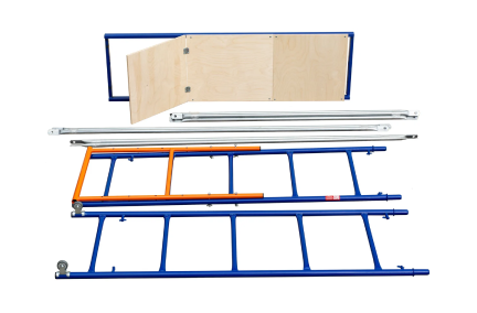Помост состоит из двух секций. Первую можно использовать самостоятельно или для работы на лестничных пролетах. За счет боковой лестницы можно увеличить длину одной из основных лестниц на 90 см(6 шагов по 15 см). Помост оснащен парой колес на одной из двух базовых лестниц, что обеспечивает удобное перемещение по объекту. За счет этого помост подходит для ремонта, отделочных и строительных работ в местах с неровным полом или на лестничных пролетах. При установке второй секции высота помоста увеличивается до 3,5 метров, таким образом он легко может заменить вышку-туру для работы на небольшой высоте.