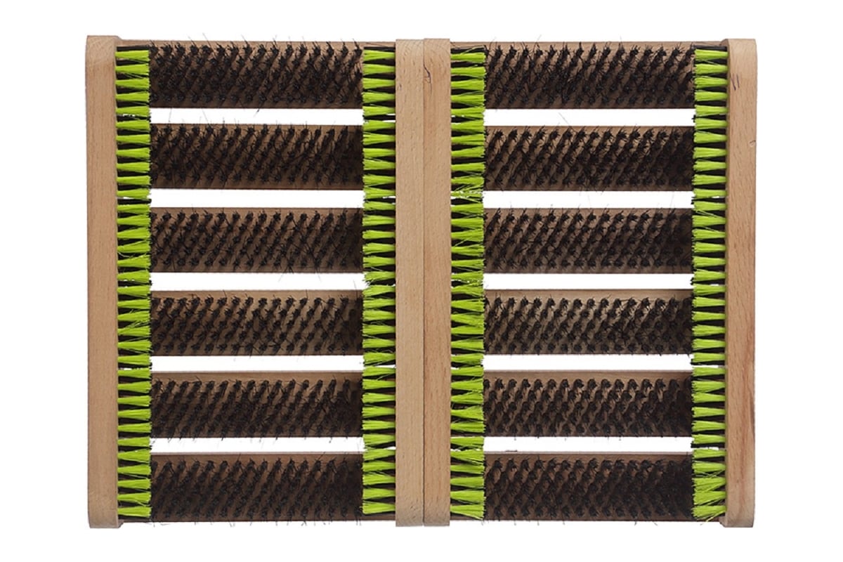 Компактный размер, по ширине свободной стойки. Жёсткий ворс, достаточно длинный для очистки объёмных подошв. Достаточно толстое деревянное основание.