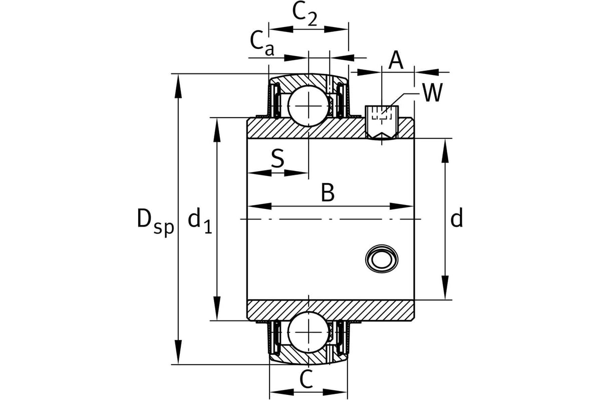 Корпусный подшипник сконструирован на основе уплотнённого радиального шарикоподшипника. Подшипник имеет сферическую поверхность наружного кольца и широкое внутреннее кольцо с установочным винтом. На внешнем кольце имеются смазочные отверстия для повторного смазывания.