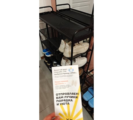 Очень (!!!) добротная обувница! собрали за 15 минут. Высокая, широкая. У нас семья из 5 человек и у каждого по 2-3 пары обуви, место хватило всем! и даже немного осталось. Полки достаточной глубины, чтобы влезли мужские ботинки и "не висели" пятка или мысок. Было весьма проблематично найти большую обувницу хорошего качества, а эта порадовала во всех смыслах.