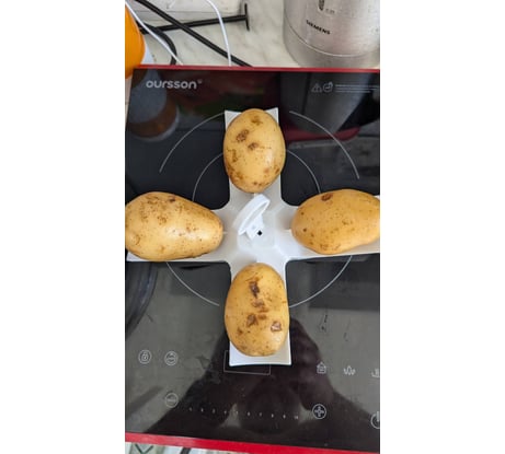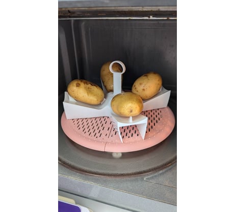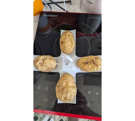 Из категории "простенько и со вкусом". Казалось бы чего проще - пластмассовая крестообразная держалка с плоскими зубцами-фиксаторами картошки и съёмная ручка. А результат - быстро и вкусно и легко чистить картошку. 15 минут в инверторной СВЧ 1000 Вт output и получаем четыре картофелины (из молодой чисто вымытой). Можно, конечно, тоже самое и на тарелке сделать в СВЧ, но на тарелке нижняя часть картофелины не пропечётся. Чем больше приподнять, тем лучше.