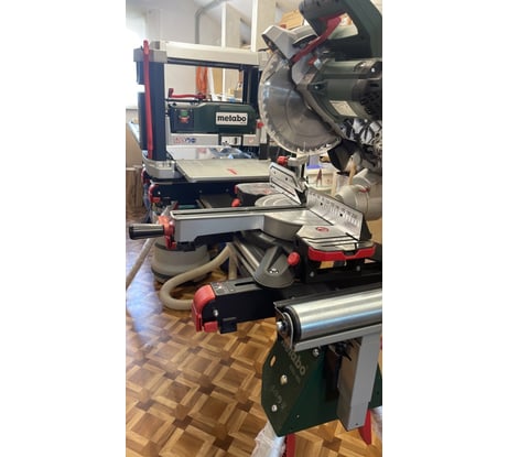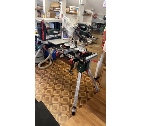 Купил в начале 2022г. за 17,3 т.р. Полезная подставка и для стационарного использования в мастерской. Для экономии места помимо торцовочной пилы установил также на подставку и рейсмус Metabo DH330, докупив комплект из двух станин (Metabo 629008000). Пришлось немного сдвинуть рейсмус, чтобы его центр тяжести находился посередине продольной линии подставки, для чего сделал 2 стальных пластины с отверстиями под крепеж и совместил проставками с шайбами горизонтальную плоскость пилы и рейсмуса. Получился универсальный компактный станок. Можно прогонять неширокие доски через рейсмус не снимая пилу, а также торцевать не снимая рейсмус - при этом в обоих случаях задействуются и штатные ролики подставки без дополнительной регулировки по высоте. В общем очень удобно получилось.