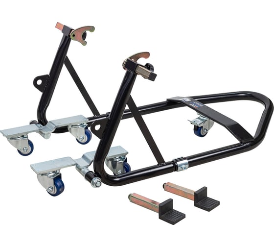 Подкат рассчитан на нагрузку до 340 кг, что делает его универсальным решением для большинства типов мотоциклов. Он незаменим при замене резины, уходе за цепью, обслуживании подвески или длительном хранении техники. Благодаря прочной конструкции кронштейн предотвращает падение мотоцикла и защищает его от повреждений.