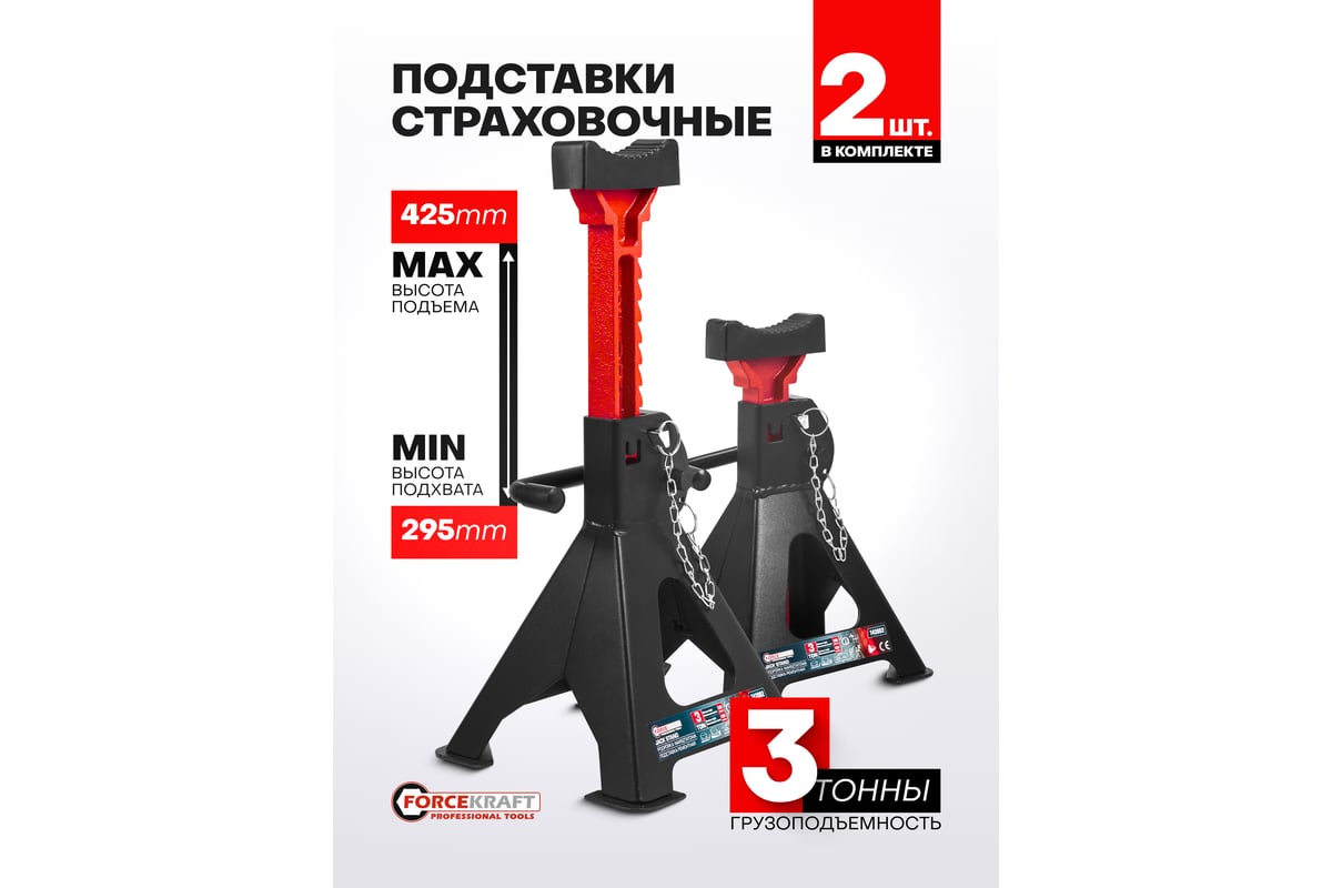 Ремонтные подставки от Forcekraft с грузоподъемностью до 3 тонн — это надежное и безопасное оборудование, предназначенное для использования в автомастерских, гаражах и других местах, где требуется подстраховка тяжелых автомобилей или грузов.