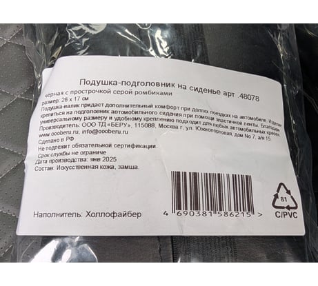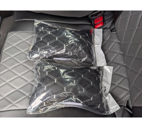 =: Подушка-подголовник на сиденье Nova Bright "косточка", черная с прострочкой серой ромбиками, 26x17см 48078 выбрал для пассарожпассажиров заднего сиденья. По сравнению с ранее купленными в другом месте подушками для водителя и переднего пассажира эти подушки показались чуть меньше в размере. Лента крепления с натяжением, но все же позволила закрепить за подголовник. Данные на этикетке отличаются от инфо в карточке товара. В целом за свою стоимость годный товар, точно полезный в дальней поездке.