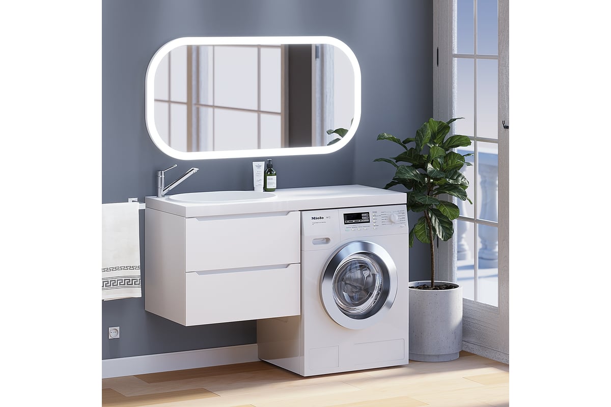Подвесная тумба под стиральную машину uperwood Tanos 60 см, с раковиной Bruks 120 см, левая, белая 291021011
