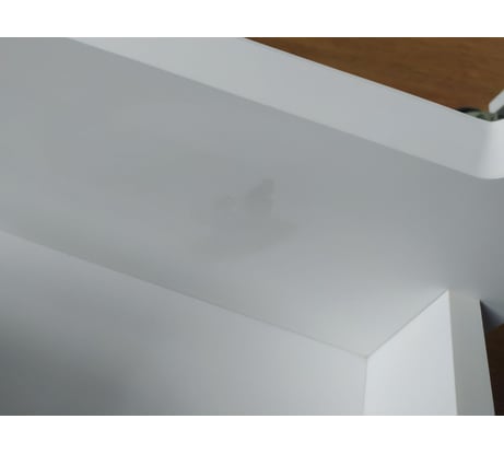 Тумба была заляпана, с глянцевых поверхностей удалить следы не трудно, но с внутренних не так уж и просто, даже растворитель не берет. Во время установки заметил дефект на нижней части тумбы, шурупом выдавило дсп, в месте крепления полки.