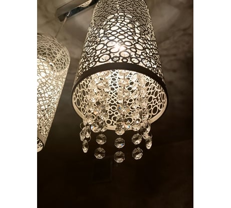 Светильник с металлическими плафонами белого цвета, украшен декоративным хрусталем, оснащен системой регулировки высоты подвеса, позволяющей размещать изделие на разных уровнях, уменьшая или увеличивая угол рассеивания светового потока. Данный светильник легко устанавливается на потолке при помощи монтажной планки.