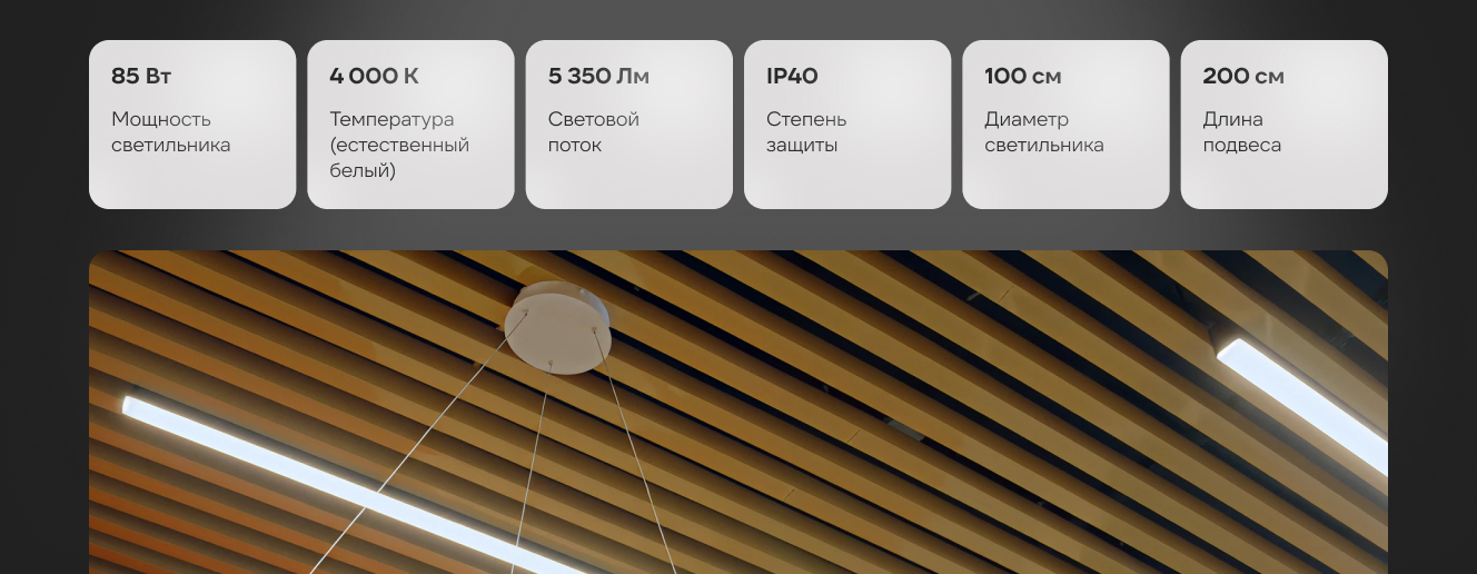 Этот светильник обеспечивает очень равномерное и мягкое освещение. Благодаря его круглой форме, свет распределяется по большому пространству без резких переходов, создавая приятную рабочую атмосферу. Визуально он смотрится аккуратно, когда висит в воздухе.