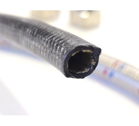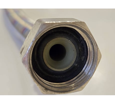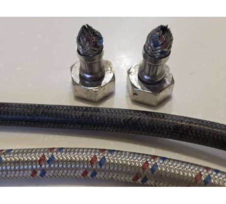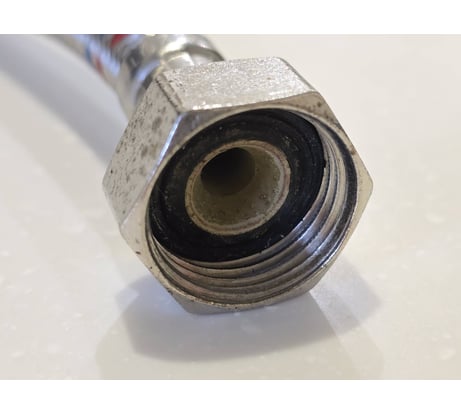 Вот и пришло время. С 2017 года лужила в качестве нижней подводки для унитаза, и еще бы прослужила если бы на ремонт и замена унитаза. Условия эксплуатации щадящие, хорошо проветривалась, однако многократно намокала из-за конденсата от бачка унитаза. Держала давление в основном 3-4 бара, однако был период когда сломался редуктор давления там давление было 8+ бар в течение 1 месяца. За 8 лет металлическая оплетка полностью жива, лопнул один "волосок". Резиновый шланг диаметром 11 мм, внутренний диаметр 8 мм, задубел и немного зарос отложениями. Со снятой оплеткой переломился только на 7 полный сгиб туда/сюда. То есть гибкость сохранилась, я удивлён.