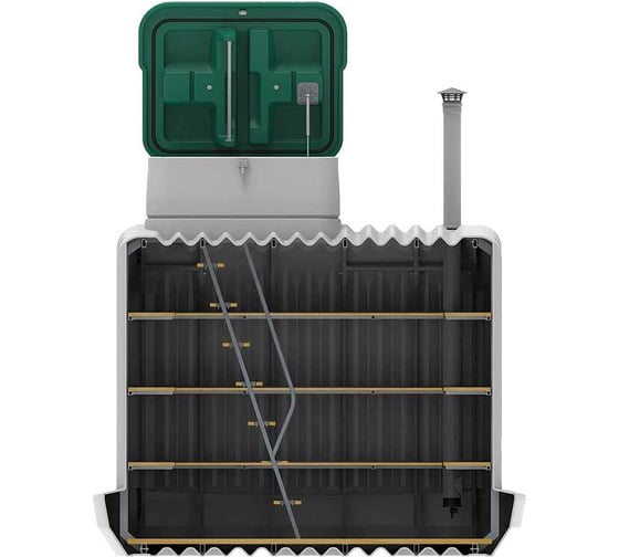 Корпус выполнен из высокопрочного полимера методом цельного формования без швов, усилен арочными ребрами жесткости и металлическим каркасом из профиля 60×30×3 мм. Утепленная пенополиуретаном горловина и крышка обеспечивают стабильную температуру внутри, минимизируя сезонные перепады.