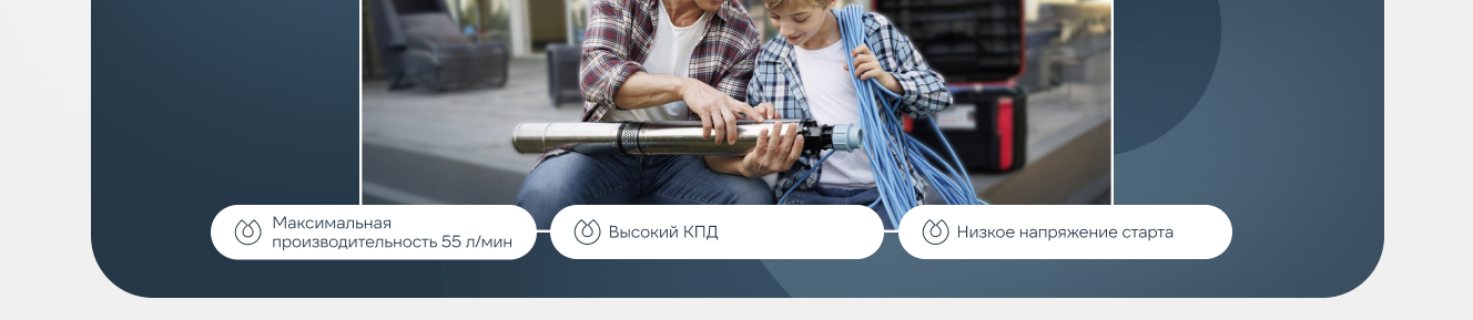 Погружной скважинный насос ECO RUS 2-45 полностью разработан в России и предназначен для подачи чистой холодной воды без абразивных веществ и волокнистых включений из скважин с внутренним диаметром не менее 98 мм, глубоких колодцев и открытых водоемов.