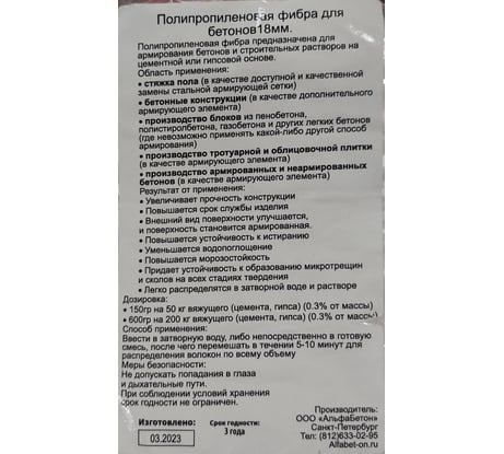Отзывы о полипропиленовой армирующей фибре AlfaBet 18 мм, 600 г 30047