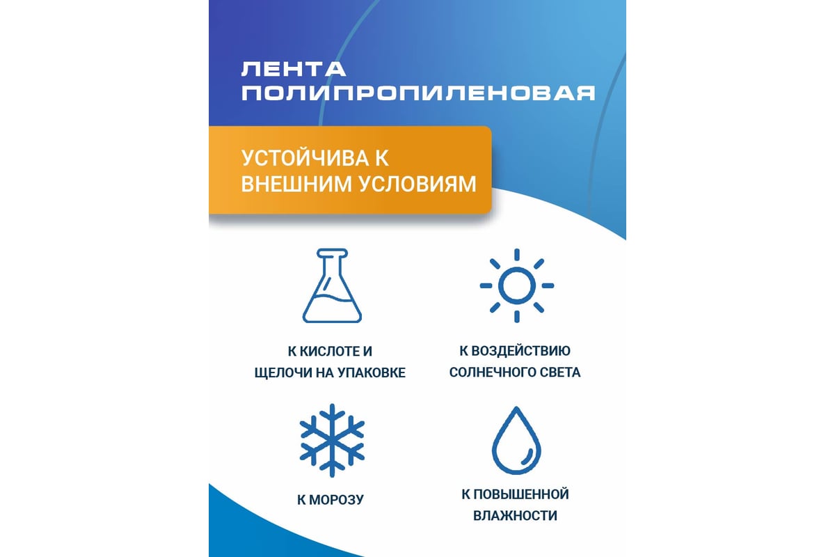 Лента отвечает требованиям высоких стандартов качества, произведена из первичного полипропилена с добавлением красителя. Лента для стреппинга проходит тест на разрывные нагрузки, серповидность и относительное удлинение при разрыве.