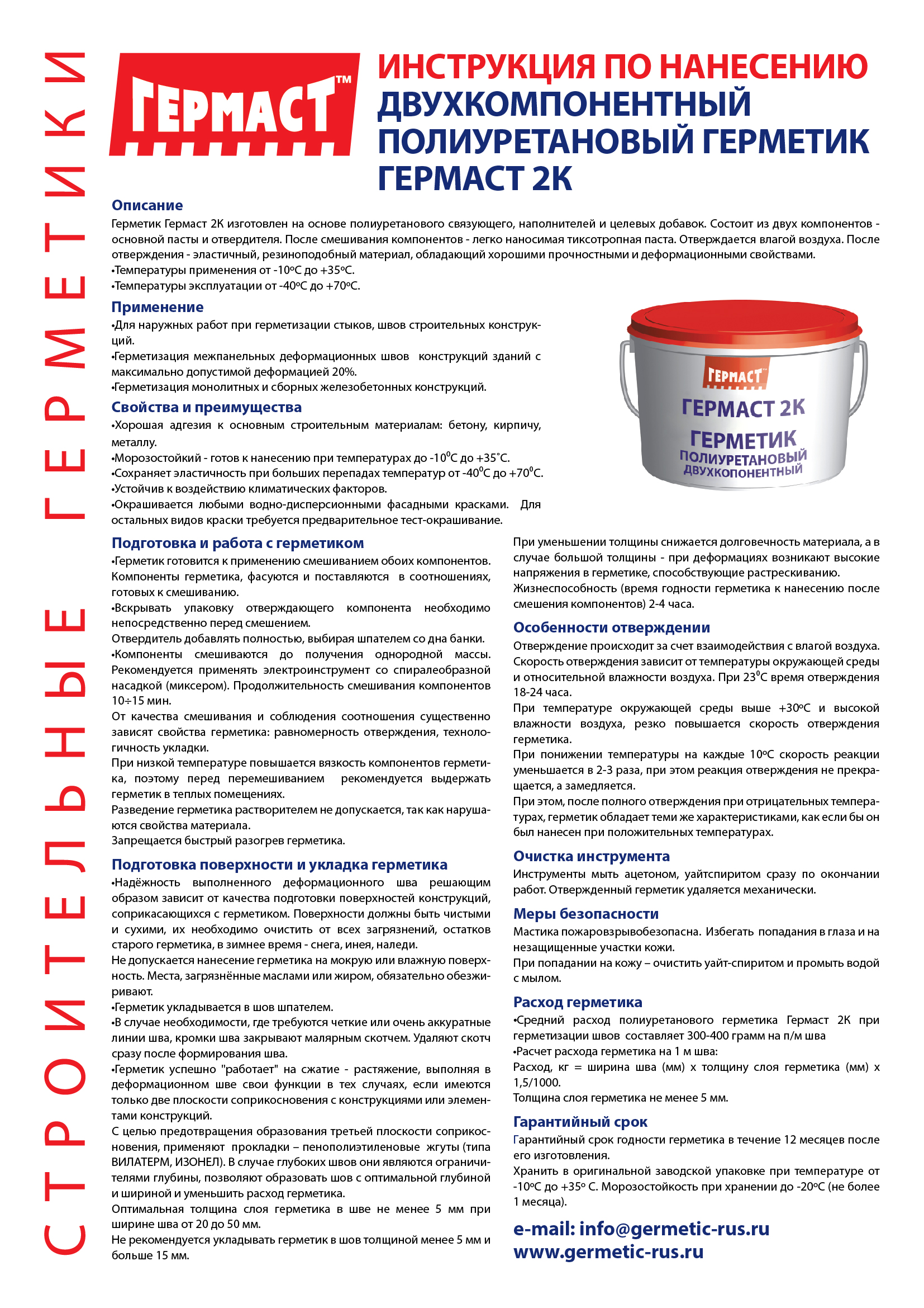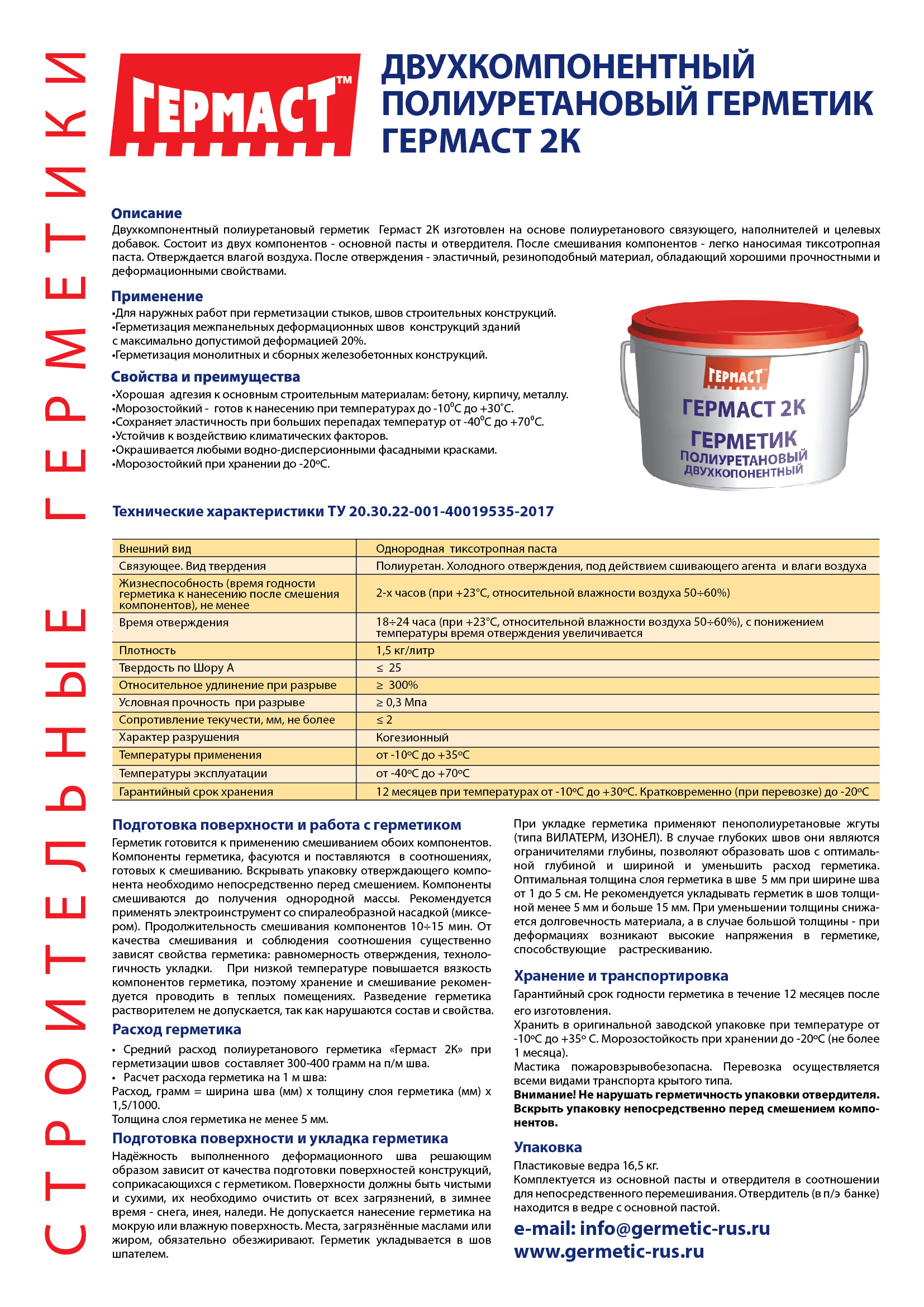 Полиуретановый двухкомпонентный герметик для наружных работ Гермаст 2К 16,5 кг, серый 61458037 применяется при наружных работах по заделке швов, стыков по фасаду панельных домов, для задач герметизации в строительстве. Прочная адгезия (прилипание) к бетону, металлу, кирпичу.