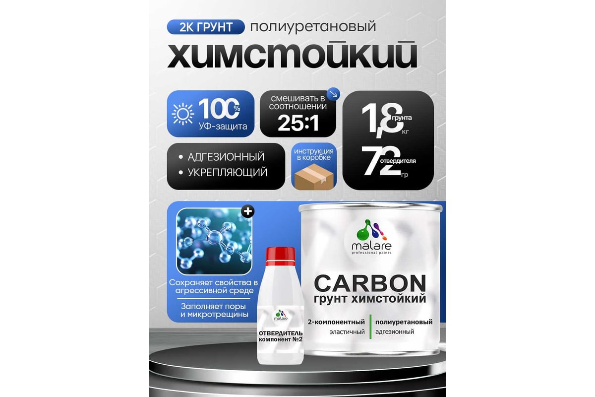 Полиуретановый грунт MALARE 2К CARBON химстойкий, двухкомпонентный, высокопрочный износостойкий укрепляющий УФ-стойкий эластичный (1.8 кг + 70 гр отвердитель) 4660504765520